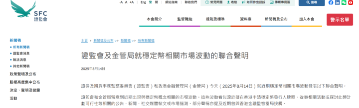 8月14日,香港证监会及香港金管局就稳定币相关市场波动发表联合声明:香港证券及期货事务监察委员会(证监会)和香港金融管理局(金管局)就近期稳定币相关市场波动发表以下联合声明。
